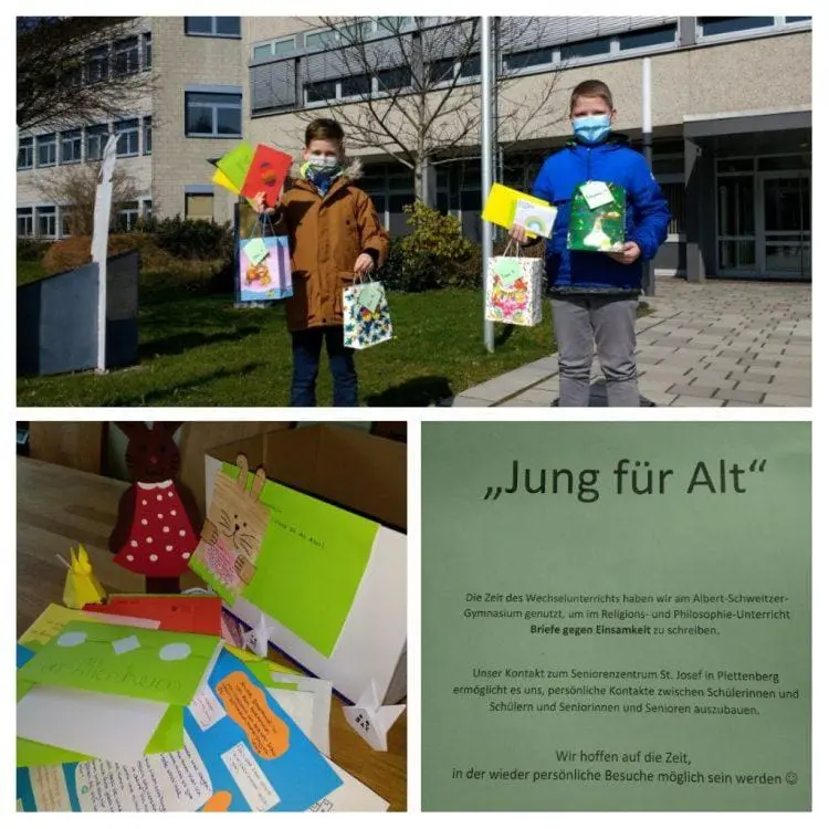 Das Albert-Schweitzer- Gymnasium hat mit der AG „Jung für Alt“ seit vielen Jahren einen Kontakt zum Seniorenzentrum St. Josef in Plettenberg. Dieser Kontakt bestand ursprünglich in Besuchen der Schülerinnen und Schüler bei Bewohnerinnen und Bewohnern im Seniorenzentrum: jung besucht alt. Seit einiger Zeit sind die aktiven Schülerinnen dazu übergegangen, den Kontakt telefonisch aufrechtzuerhalten.