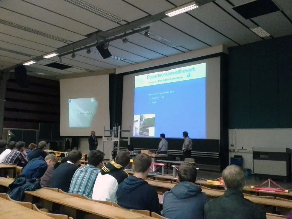 Am 25.02.2014 stand nach mehrmonatiger Wettbewerbsphase endlich das Finale des Papierbrückenwettbewerbes auf dem Plan. Sieben Schüler der Jahrgangsstufen EF und Q1 hatten sich darauf seit der Einführungsveranstaltung Ende 2013 vorbereitet. Ziel des Wettbewerbes war es, eine möglichst leichte Brücke zu konstruieren, die dabei eine möglichst hohe Traglast aushalten sollte. Als Baumaterialien waren dabei vom Veranstalter, dem Fachbereich Bauingenieurwesen der Universität Siegen, ausschließlich handelsüblicher Kleber und Papier erlaubt.
