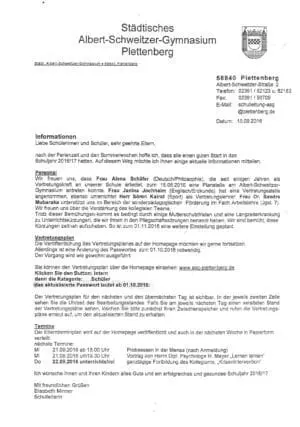 nach der Ferienzeit und den Sommerwochen hoffe ich, dass alle einen guten Start in das Schuljahr 2016/17 hatten. Auf diesem Weg möchte ich lhnen einige aktuelle Informationen mitteilen.