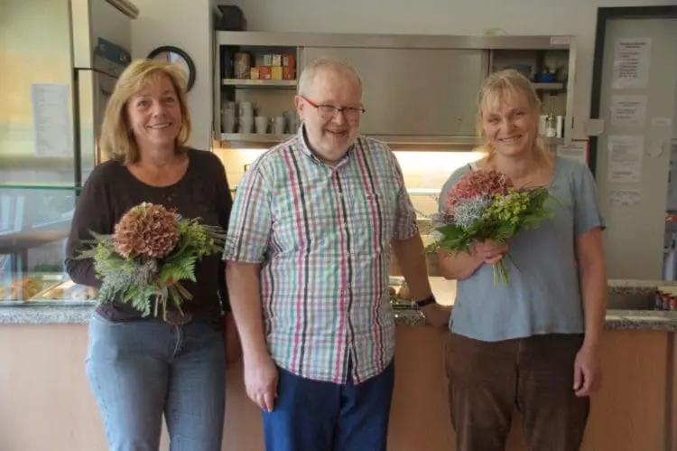 Insgesamt 69 Helferinnen und Helfer sind in diesem Schuljahr in der Cafeteria engagiert und versorgen die Schüler des ASG morgens mit Brötchen, Milch, etc. Jetzt wurden zwei langjährige Helferinnen von Dr. Ludwig Erbeling verabschiedet: Petra Polo und Beate Behrensmeier hatten am Freitag, den 30. September nach 8 bzw. 9 Jahren aktiver Hilfe in der Cafeteria des ASG ihre letzte Schicht, ihren letzte Arbeitstag in der Cafeteria. Im Namen aller Schüler und Lehrer bedankte sich Dr. Ludwig Erbeling bei den beiden Damen.
