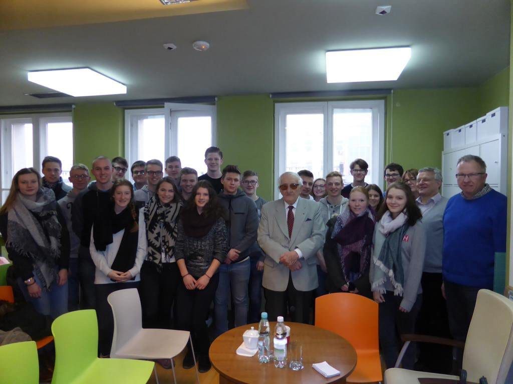 Natürlich war die Besichtigung der Gedenkstätten sehr beeindruckend und auch bedrückend, doch besonders bewegt waren wir vor allem durch das Gespräch mit dem Zeitzeugen, Karol Tendera, der es geschafft hatte, vier Jahre in diesen unvorstellbar grausamen Lagern zu überleben, und uns seine Erlebnisse aus dieser Zeit näher brachte. Dreieinhalb Stunden hörten wir einer unglaublichen Geschichte zu, von einer zweimaligen Flucht aus der Zwangsarbeit, von seiner Verhaftung und der Inhaftierung im sogenannten „Stammlager“ Auschwitz, von unerträglichem Leid und vier Jahre anhaltender Todesangst, von schwerster physischer und psychischer Belastung und von waghalsigen Versuchen, dem Tod zu entgehen, oder in Worten des Zeitzeugen, „der Hölle“ zu entgehen. Eine Geschichte, die gut und gerne einen spannenden Hollywood-Film füllen konnte – tatsächlich jedoch die wahre Geschichte des Mannes ist, der sie uns erzählte.