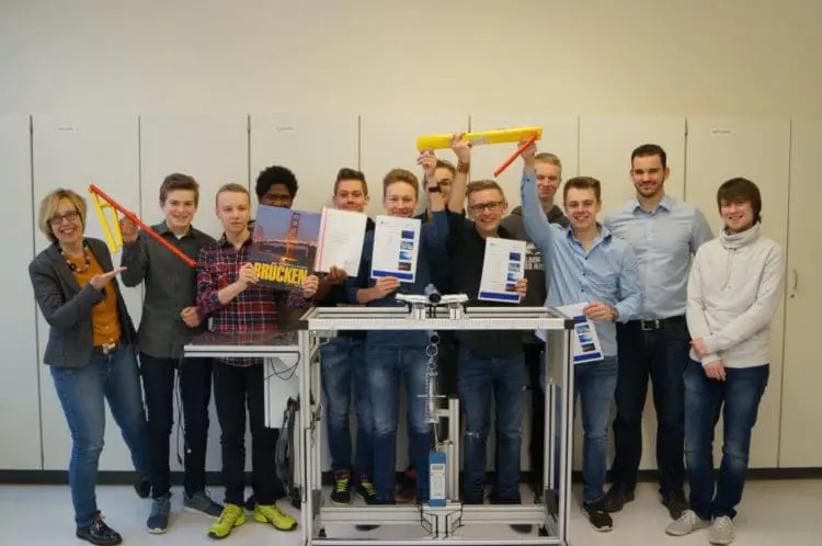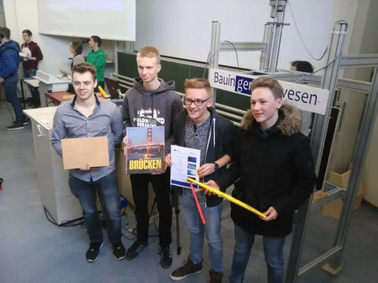 Die Gewinnerbrücke hielt bei einem Eigengewicht von bloß 152 Gramm einer Last von umgerechnet 16,8 Kilogramm stand. Das zweite Team unserer Schule erreichte mit ihrer Brücke Platz 7 in der Gesamtwertung.