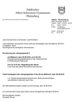 Unterrichtsbeginn der Jahrgangsstufen 6 bis Q2 am Mittwoch, dem 29.08.2018