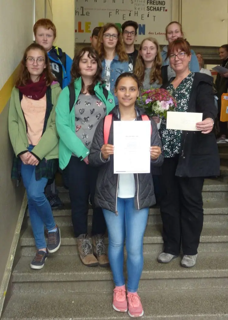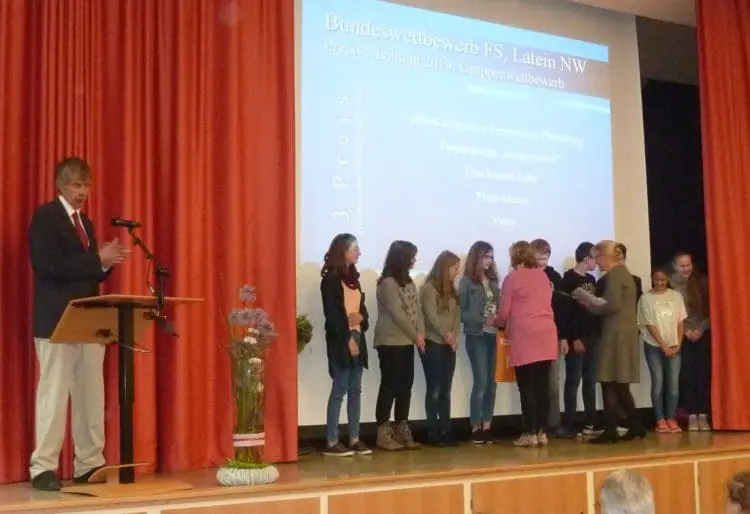 Zehn Schülerinnen und Schüler der Klasse 7 von Frau Lobe nahmen mit ihrem lateinischen Video „Mons saevus“, in dem es um eine Klassenfahrt zum Vesuv geht, am Wettbewerb teil und wurden mit dem 3. Platz auf Landesebene ausgezeichnet. Dies erfreute alle besonders, weil es ihre erste Teilnahme an dem Wettbewerb war und die Dreizehnjährigen zu den jüngsten Siegerinnen und Siegern gehören. Sie danken allen Eltern und Freunden, die dieses Projekt gefördert haben.