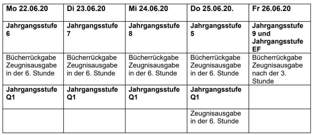 Zur Orientierung schicke ich Ihnen die Übersicht über den Ablauf der letzten Schulwoche. Die Zeugnisse werden für die jeweiligen Jahrgangsstufen in der letzten Stunde des Schultages durch die Klassen- bzw. Stufenleitung ausgehändigt. Die Bücherrückgabe erfolgt ebenfalls an diesem Schultag. Die Bücherbestellliste für das nächste Schuljahr händigen die Klassenleitungen den Schülerinnen und Schülern aus.