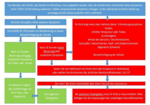 „Vor Betreten der Schule, also bereits im Elternhaus, muss abgeklärt sein, dass die Schülerinnen und Schüler keine Symptome einer COVID-19-Erkrankung aufweisen. Sollten entsprechende Symptome vorliegen, ist eine individuelle ärztliche Abklärung vorrangig und die Schule zunächst nicht zu betreten. Bei Erkältungssymptomen sind viele Eltern unsicher, ob sie ihr Kind in die Schule schicken dürfen. Im Bildungsportal steht ein Schaubild.“ (siehe Schulmail: Zum Schulbetrieb in Corona-Zeiten ab 01.09.2020 vom 31.08.2020)