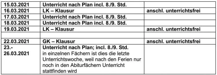 Der Unterricht für die Jahrgangsstufen 5 bis EF wird laut Stundenplan von der ersten bis zur sechsten Stunde erteilt; der Nachmittagsunterricht findet in Distanz (Aufgaben per Logineo) statt.