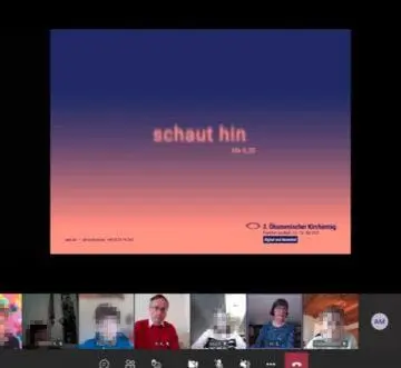 Mit dem Glockengeläut der Friedensglocke aus Dresden füllt sich der Bildschirm aller an der Andacht Teilnehmenden mit den uns allen inzwischen so bekannten Kreisen, Bildern, Anfangsbuchstaben, manch ein Teilnehmer hat auch die Kamera eingeschaltet.