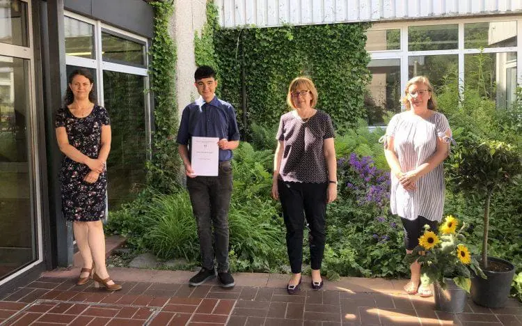 Zum zweiten Mal wurde an unsere Schule am vergangenen Samstag der Abschluss im Förderschwerpunkt Lernen vergeben. Yusuf Gezek erhielt in einer coronabedingt kleinen Feier, im Kreise seiner Familie, unserer Schulleiterin Elisabeth Minner und der Sonderpädagoginnen Katharina Gerdes und Wibke Zimmermann sein Abschlusszeugnis. Seine ehemaligen Lehrerinnen und Lehrer sowie Mitschülerinnen und Mitschüler sprachen Yusuf per Brief und Sprachnachricht Glückwünsche und gute Wünsche aus. Musikalisch untermalt wurde die Feier durch einen Liedbeitrag von Elisa Zimmermann. In den letzten sechs Jahren besuchte Yusuf das ASG. Frau Minner und Frau Zimmermann ließen in ihren Ansprachen die gemeinsame Zeit Revue passieren und betonten, dass die Arbeit in den Klassen des Gemeinsamen Lernens für alle Beteiligten neue Perspektiven eröffnet habe. Yusuf absolviert im kommenden Schuljahr einen Kurs zur Ausbildungsvorbereitung.