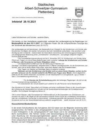 Wie bereits vor den Herbstferien angekündigt, verändert die Landesregierung die Regelungen zur Maskenpflicht ab dem 02.11.2021. Im Folgenden finden Sie die entsprechenden Auszüge aus der Schulmail des Ministeriums (vom 29.10.21):