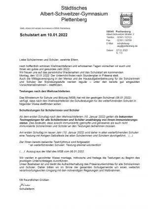 Am ersten Schultag im neuen Jahr (10. Januar 2022) wird daher in allen weiterführenden Schulen eine Testung mit Antigen-Selbsttests bei allen Schülerinnen und Schülern durchgeführt. (…)
