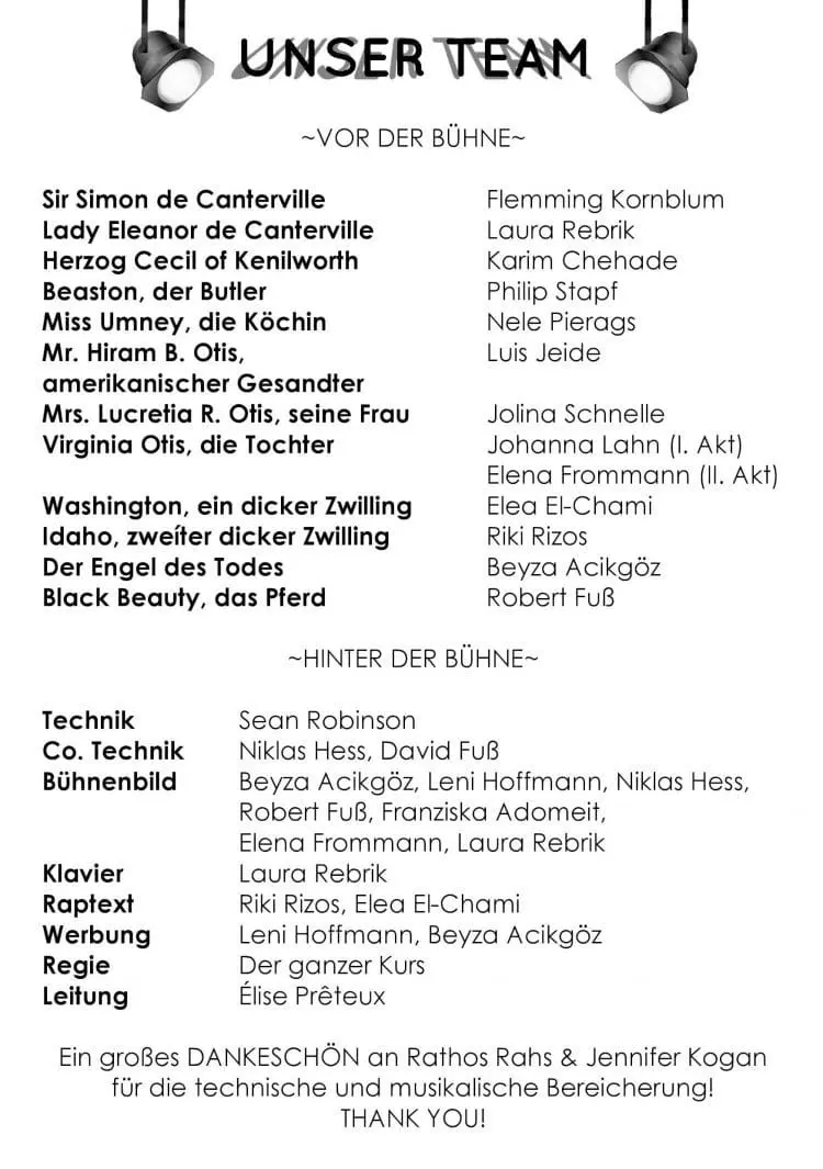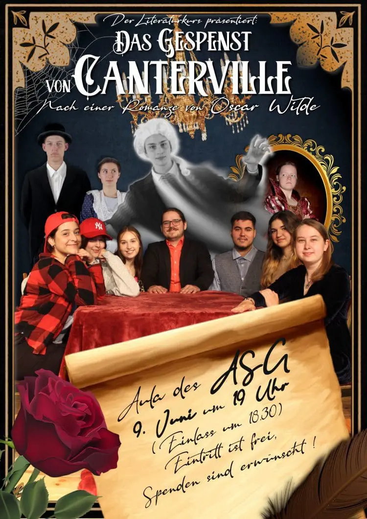 Anders als die Amerikaner um die Familie Otis, hat das Gespenst von Canterville am Donnerstag Abend (09.06.2022) das Publikum beeindruckt. Der Literaturkurs von Madame Ptretêux hat das Stück angelehnt an die Romanze von Oscar Wilde in der gut gefüllten Aula des Albert-Schweitzer-Gymnasiums präsentiert. Hier dazu ein paar Eindrücke: