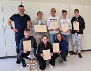 Beim diesjährigen Wasserraketenwettbewerb stellten erneut viele selbst konstruierte Raketen ihre Flugtauglichkeit unter Beweis. Die Wasserraketen wurden dabei im Vorfeld aus handelsüblichen PET-Flaschen konstruiert. Anbauteile aus dem 3D Drucker sowie Schlauchzubehör für einen gezielten Start wurden ebenfalls genutzt. Das Siegerteam um Lukas Angermann, Linus Bittner sowie Adriano erreichte eine beeindruckende Flugzeit von 11,8 Sekunden. Die Teammitglieder dürfen sich über einen Cafeteriagutschein freuen und haben schon Ideen zur Weiterentwicklung der Rakete für den nächsten Wettbewerb im Blick. Den zweiten Platz belegte mit der Zeit von 4,5 Sekunden das Team um Sebastian Kloß, Julia Dubiel, Leonie Rohlender, Franziska Brehme und Jennifer Kogan. Marco Seiler, Yagmur Turhan, Maximilian Pahomov und Melike Öztürk belegten den dritten Platz mit einer Flugzeit von 4,4 Sekunden.