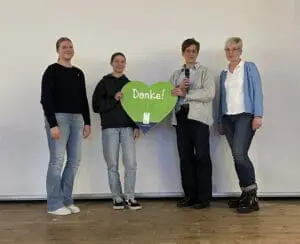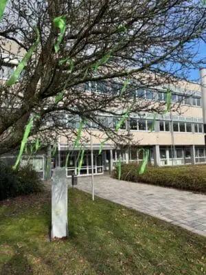 Gemeinsam bildete die Schulgemeinde ein großes Herz und hielt die grünen Bänder, die für den Tag der Kinderhospizarbeit stehen, hoch. Diese Bänder wurden anschließend vor dem Haupteingang der Schule an den Bäumen befestigt, um auf diesen bedeutenden Tag aufmerksam zu machen.