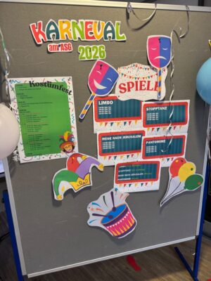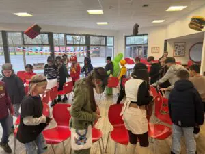 Mit bunten Kostümen, teilweise sogar Gruppenverkleidungen, versuchten sich die Fünftklässler an dem spielerischen Programm, das aus dem beliebten Spiel ,,Reise nach Jerusalem”, dem Klassiker ,,Stopptanz” sowie dem tänzerischen ,,Limbo” und dem Ratespiel ,,Pantomime” bestand.