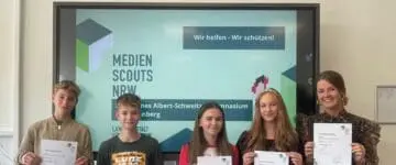 Die vier Medienscouts Tom Höfner, Jannis Föste, Naomi Bage und Sophia Reinecke des Städtischen Albert-Schweitzer-Gymnasiums besuchten gemeinsam mit Frau Kroczek am 14.08.23 einen Aufbauworkshop zum Thema „#whatthefake - Meinungsbildung im Netz“ ...