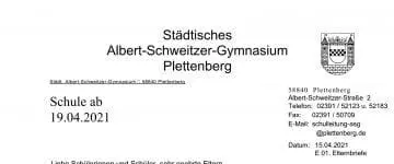 Elternbrief 15. April 21: Schule ab 19.04.21