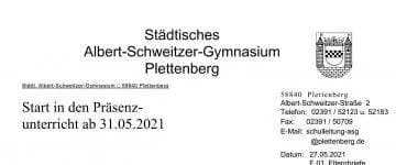 Sehr geehrte Eltern, wie Sie aus der Presse erfahren haben, hat die Landesregierung auf Grund der sinkenden Infektionszahlen beschlossen, dass an allen Schulen ab dem 31. Mai 2021 wieder vollständiger Präsenzunterricht stattfinden ...