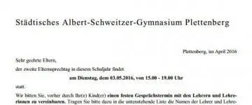 Sehr geehrte Eltern, der zweite Elternsprechtag in diesem Schuljahr findet am Dienstag, dem 03.05.2016, von 15.00 - 19.00 Uhr statt. Wir bitten Sie, vorher durch Ihr(e) Kind(er) einen festen Gesprächstermin mit den Lehrern ...
