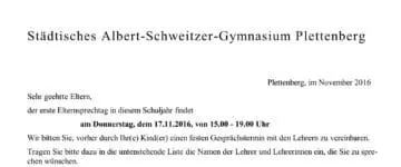 Sehr geehrte Eltern, der erste Elternsprechtag in diesem Schuljahr findet am Donnerstag, dem 19.11.2015, von 15.00 - 19.00 Uhr Wir bitten Sie, vorher durch Ihr(e) Kind(er) einen festen Gesprächstermin mit den Lehrern zu vereinbaren. Tragen ...