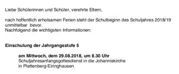 Liebe Schülerinnen und Schüler, verehrte Eltern, nach hoffentlich erholsamen Ferien steht der Schulbeginn des Schuljahres 2018/19 unmittelbar bevor. Nachfolgend die wichtigsten Informationen: Einschulung der Jahrgangsstufe 5 am Mittwoch, ...