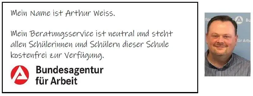 - regelmäßige Studien- und berufswahlbezogene Beratungen durch Herrn Weiss von der Agentur für Arbeit